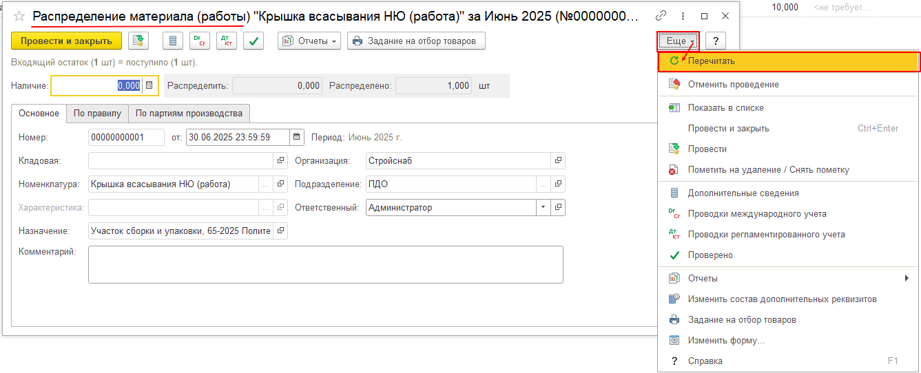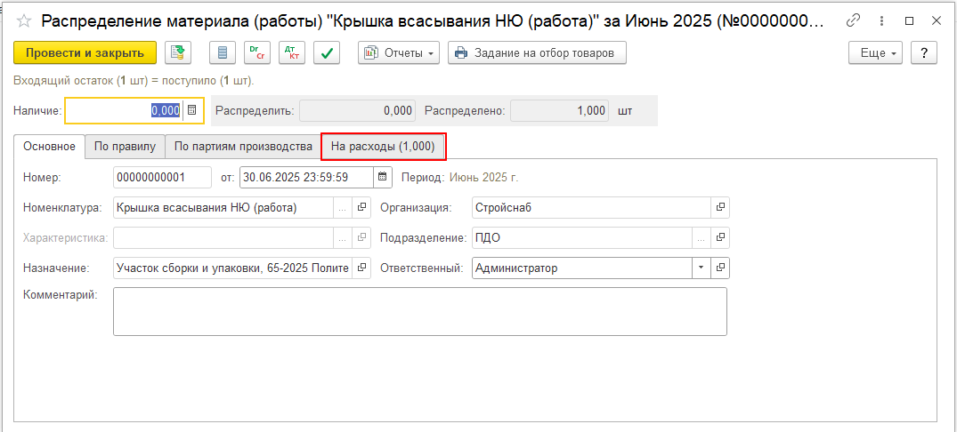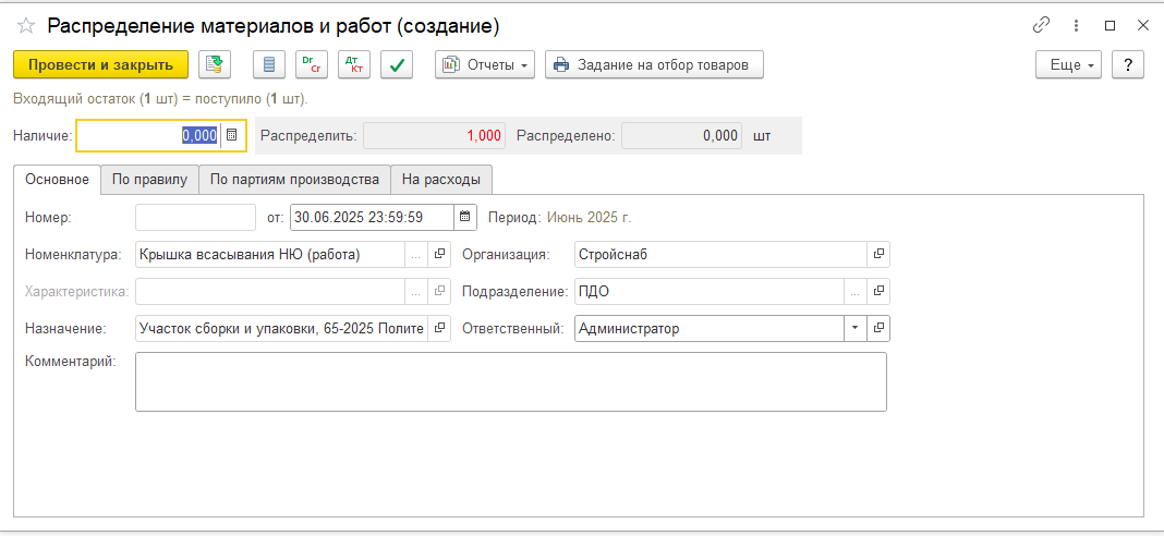 3. Собранные затраты при выпуске номенклатуры с назначением и видом запасов «Полуфабрикат давальца» были перенесены на выпущенную нами работу с тем же назначением, что и номенклатура. Нужно отнести эти расходы на нашу номенклатуру. Мы с вами это сделаем с помощью документа «Распределение материала (работы)».