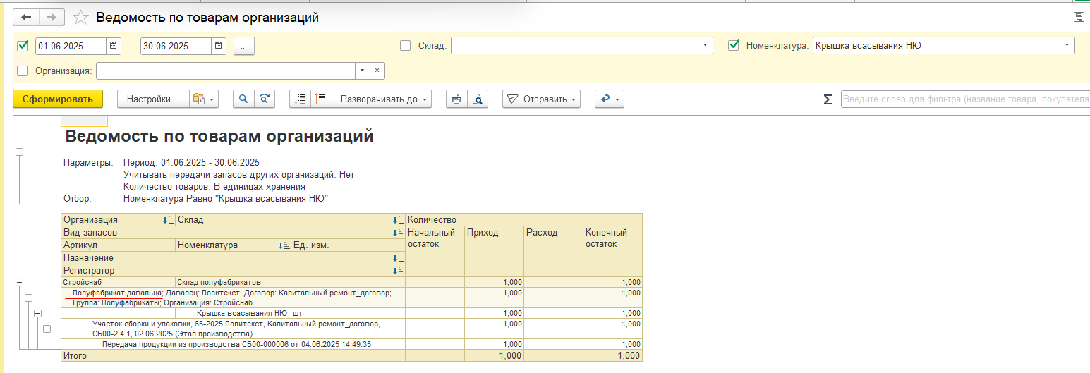 Рассмотрим пример на номенклатуре «Крышка всасывания НЮ», которая имеет Вид запасов «Полуфабрикат давальца».