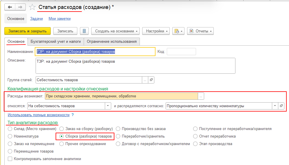 2. Создадим необходимую Статью расходов с нужными настройками (раздел Финансовый результат и контроллинг – Настройки и справочники – Статьи расходов - Создать). Для нашего примера создадим Статью расходов «ТЗР: на документ Сборка (разборка) товаров»: