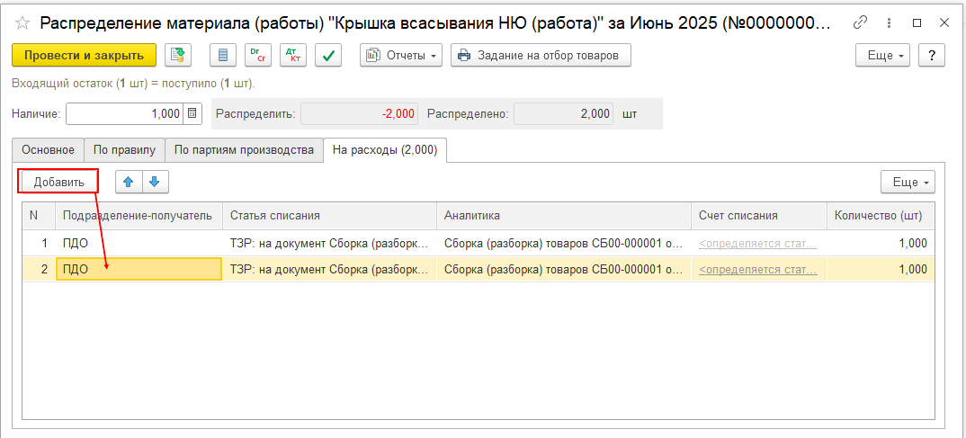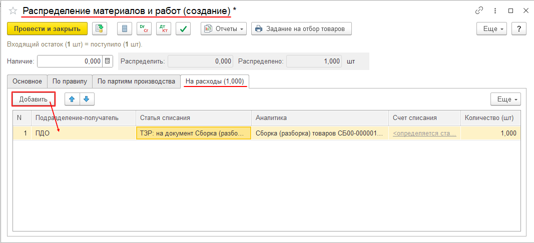 В документе «Распределение материала (работы)» в табличную часть на закладке «На расходы» с помощью кнопки «Добавить» добавляем новую строку, где указываем всю необходимую информацию, как это было описано выше.