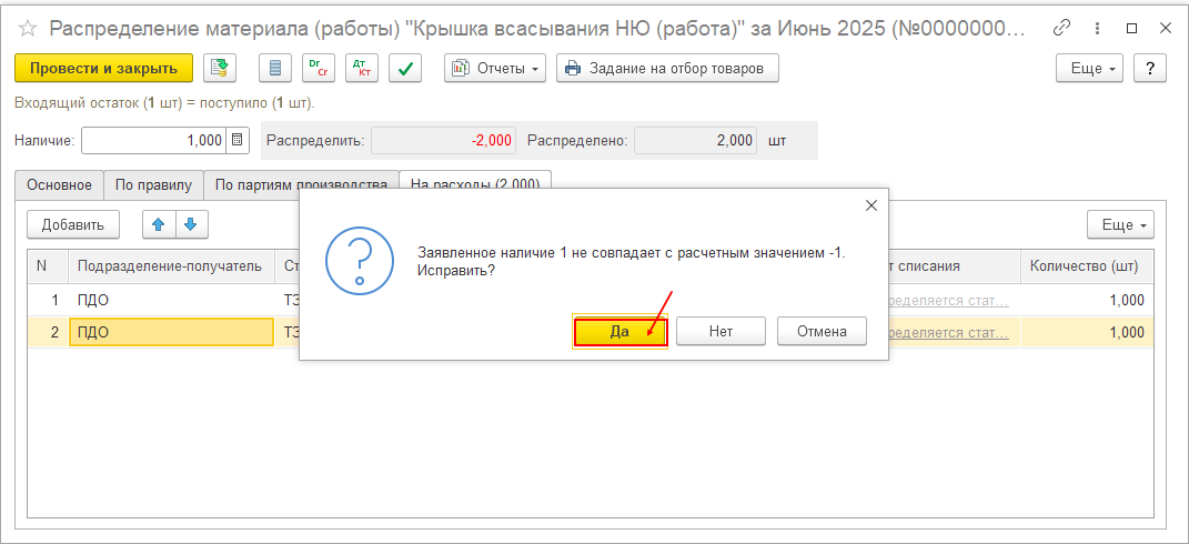 В таком случае нажимаем кнопку «Да», после чего снова нажимаем кнопку «Провести и закрыть».