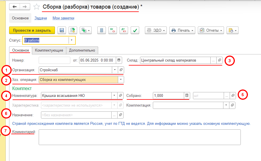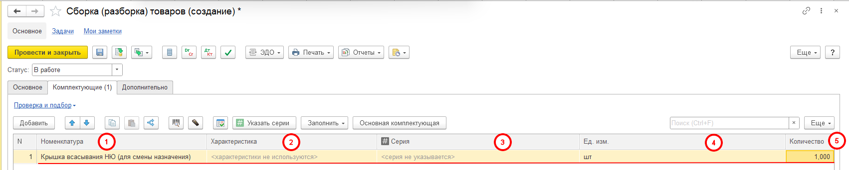 Если в документе «Сборка (разборка) товаров» указываются статусы, то меняем статус с «В работе» на «Собрано (разобрано)» и проводим созданный документ.