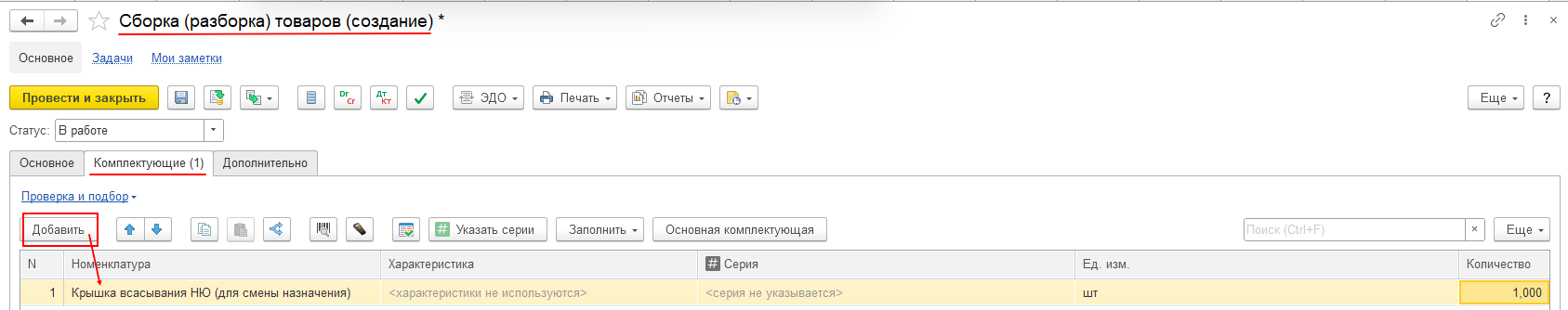 На закладке «Комплектующие» с помощью кнопки «Добавить» добавляем новую строку в табличную часть.