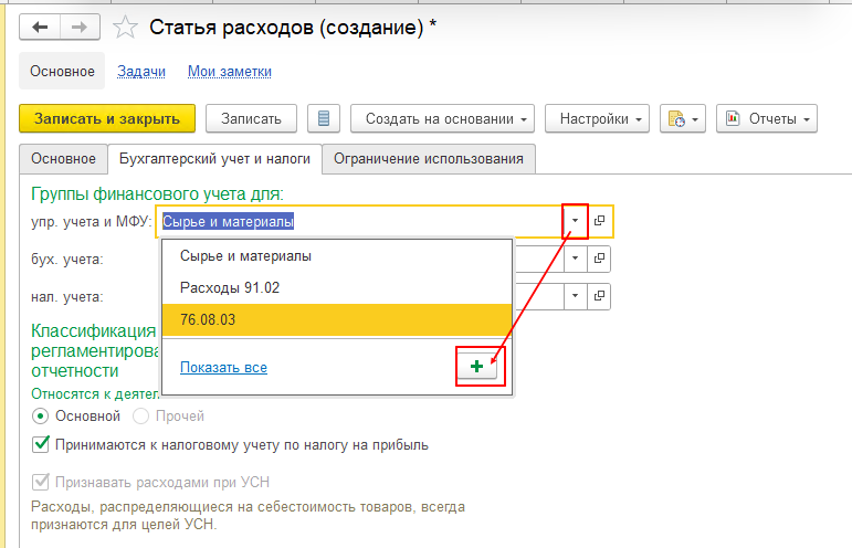 Если Группы финансового учета с нужными настройками отсутствует, создаем ее с помощью кнопки «Создать».