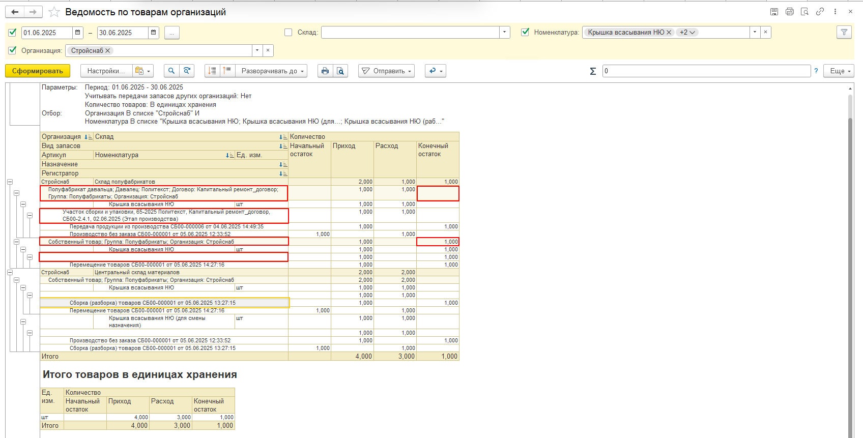 Посмотрим Отчет «Ведомость товаров организации» с движением по нашей номенклатуре в разрезе «Назначения» и «Вида запасов» по складам: