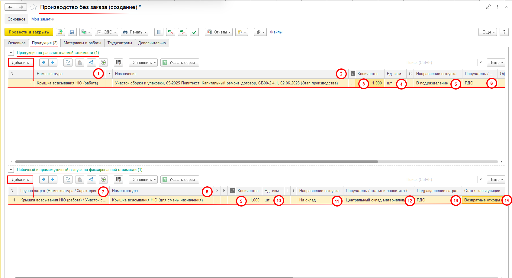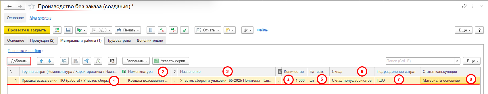 После проведения документа «Производство без заказа» со склада будет потреблена исходная номенклатура с назначением, а в системе 1C: ERP будут выпущены работа с назначением в подразделение «ПДО» и номенклатура с похожим названием на склад и с видом запасов «Собственный товар»