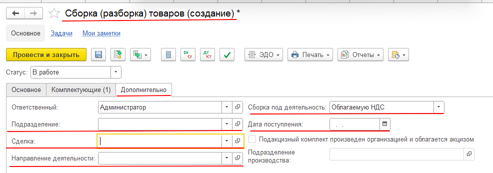 На закладке «Дополнительно» в нашем примере ничего заполнять не будем, но при необходимости можно указать «Подразделение», «Дату поступления», или «Сборку под деятельность», также выбрать «Сделку», «Направление деятельности