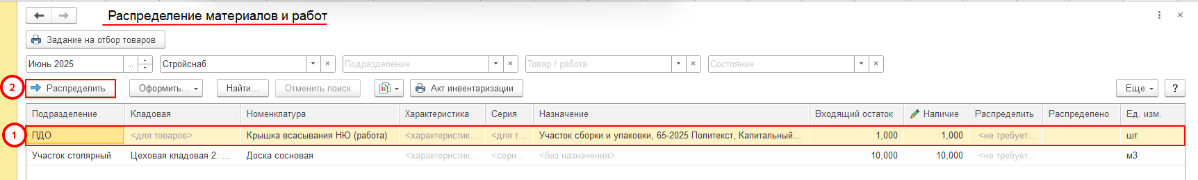 Документ расположен в разделе «Производство» - «Внутрицеховой учет» - «Распределение материалов и работ».