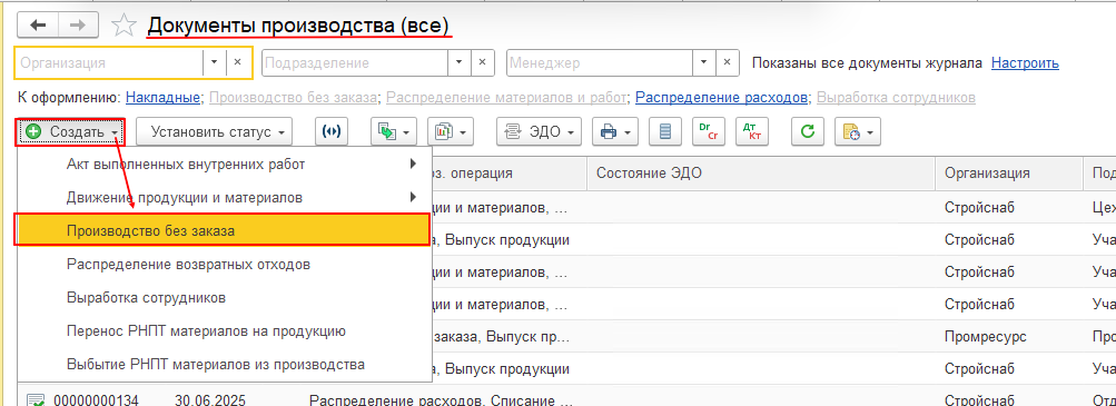 1. Для выполнения выпуска номенклатуры на баланс должен быть сформирован документ «Производство без заказа». Сделать это можем в разделе Производство – Внутрицеховой учет – документы производства (все).