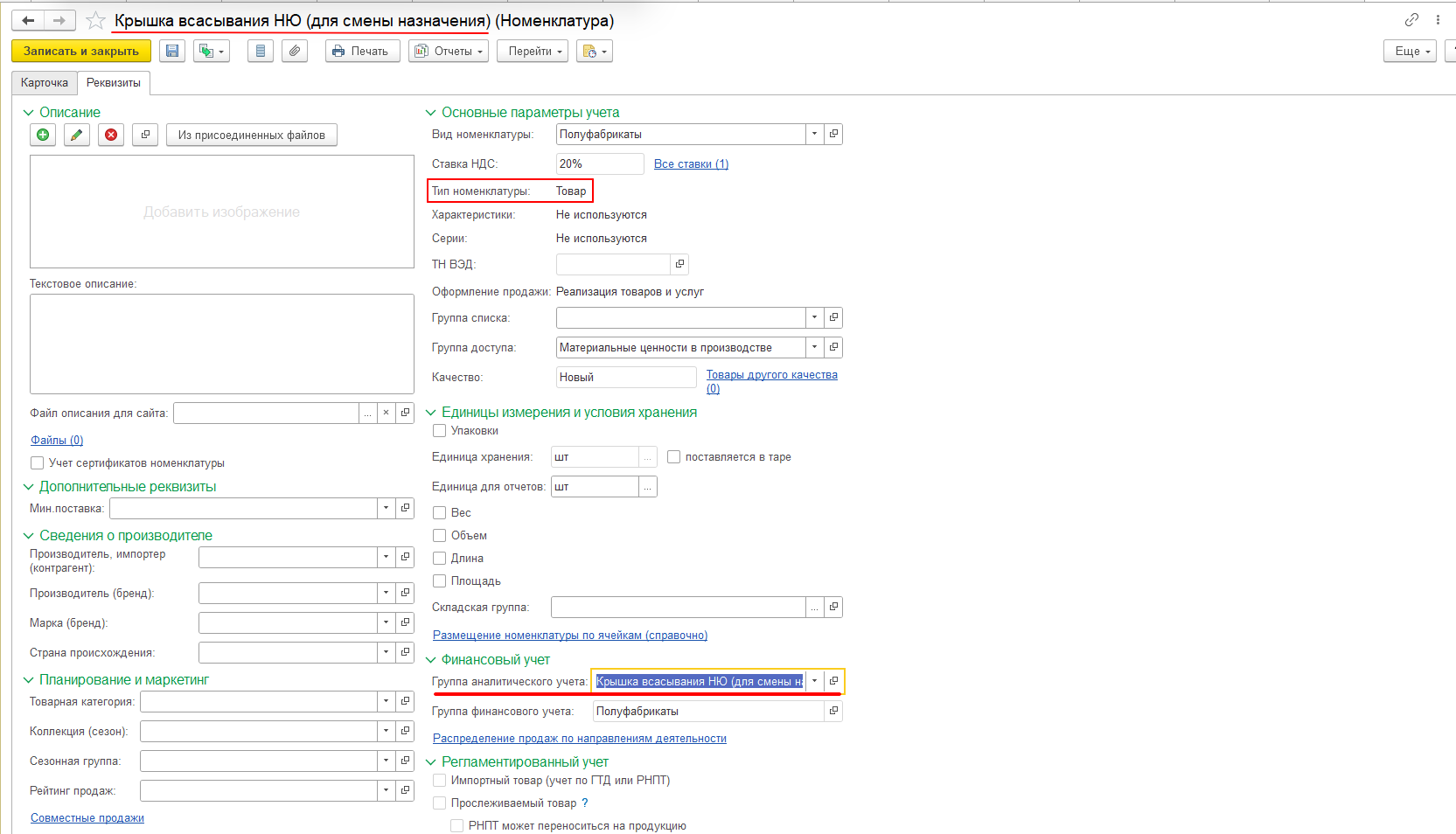 - Создадим для нашего примера новую номенклатуру «Крышка всасывания НЮ (для смены назначения)» с типом номенклатуры «Товар»:
