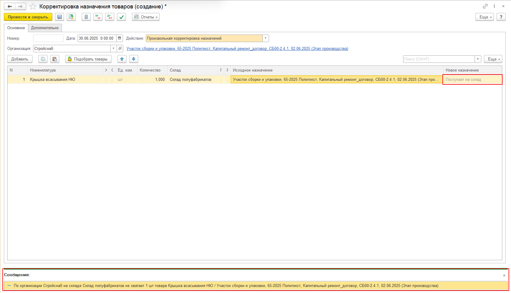 При попытке снять назначение по номенклатуре «Крышка всасывания НЮ» с помощью документа Корректировка назначения товаров, мы увидим с вами ошибку «По организации Стройснаб на складе Склад полуфабрикатов не хватает 1 шт товара Крышка всасывания НЮ / Участок сборки и упаковки, 65-2025 Политекст, Капитальный ремонт_договор, СБ00-2.4.1, 02.06.2025 (Этап производства)».