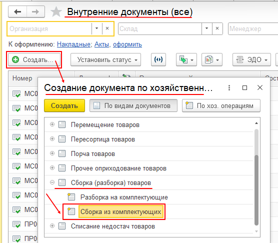 2. По строке «Хоз. операция» выбираем «Сборка из комплектующих»;
