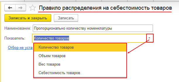 - По строке «Распределяются согласно:» указываем правило распределения стоимости на номенклатуру. Например, у меня выбрано правило «Пропорционально количеству номенклатуры», но вы можете установить любое другое правило и выбрать иной показатель для распределения: