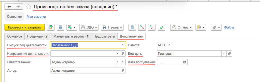 Закладки «Трудозатраты» и «Дополнительно» заполнять не будем. На закладке «Дополнительно» при необходимости можно указать направление деятельности, вид цены, дату поступления или сменить информацию о Выпуске под деятельность: