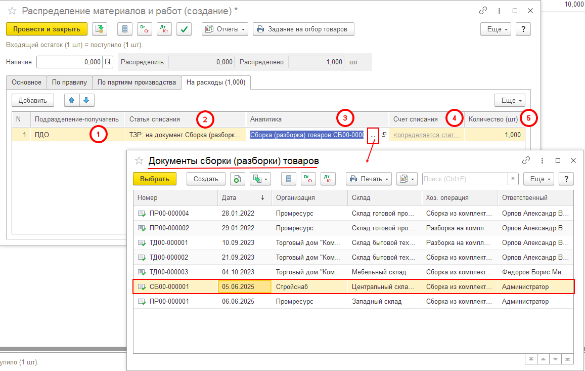 2. В колонке «Статья списания» выбираем созданную ранее Статью расходов. В нашем примере это «ТЗР: на документ Сборка (разборка) товаров».