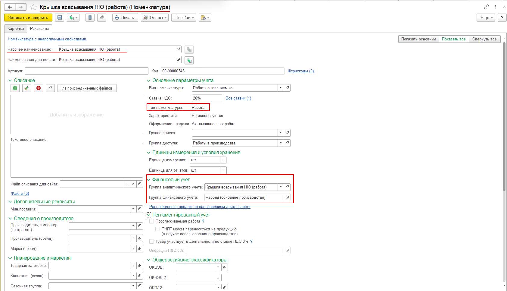 - Создадим для нашего примера новую номенклатуру «Крышка всасывания НЮ (работа)» с типом номенклатуры «Работа»: